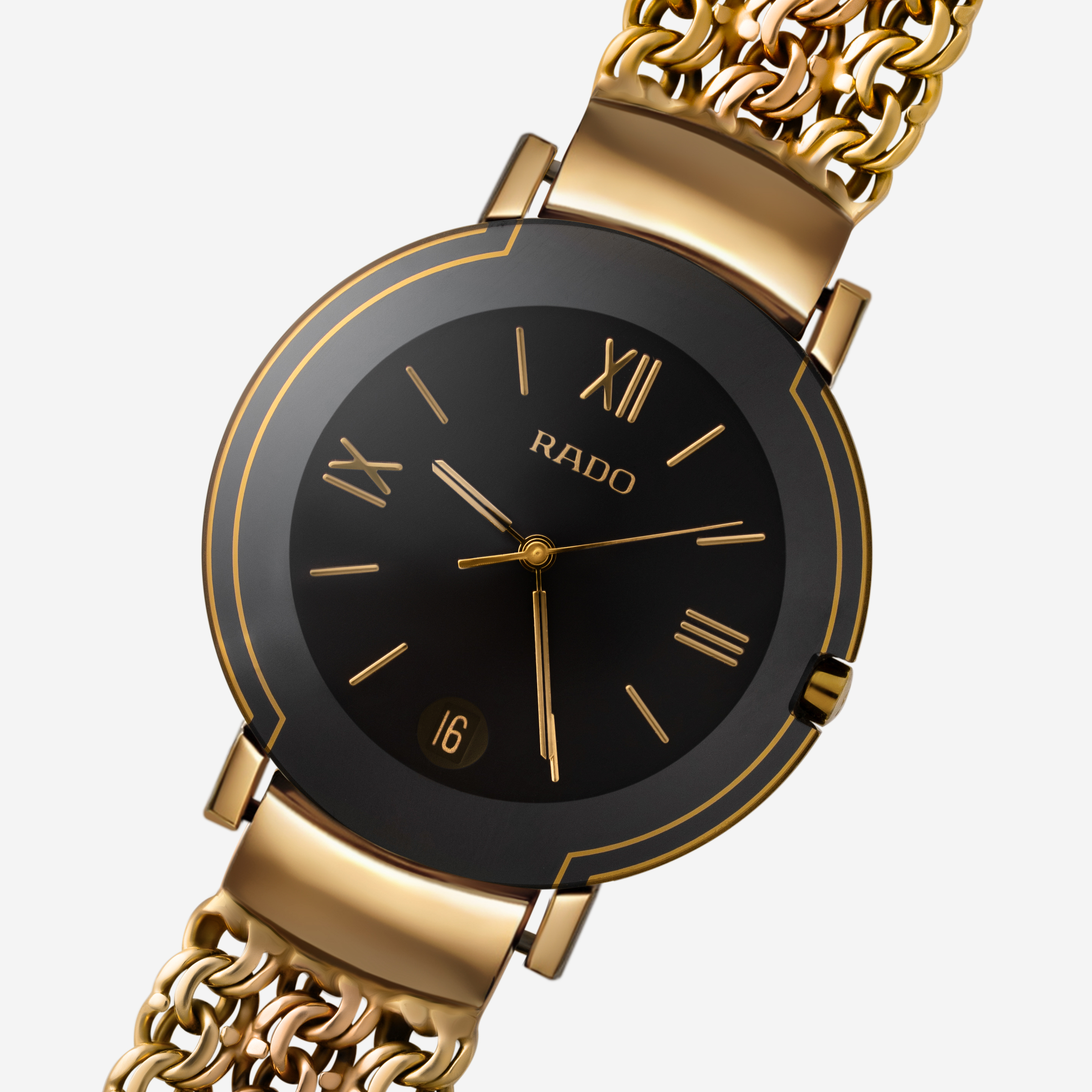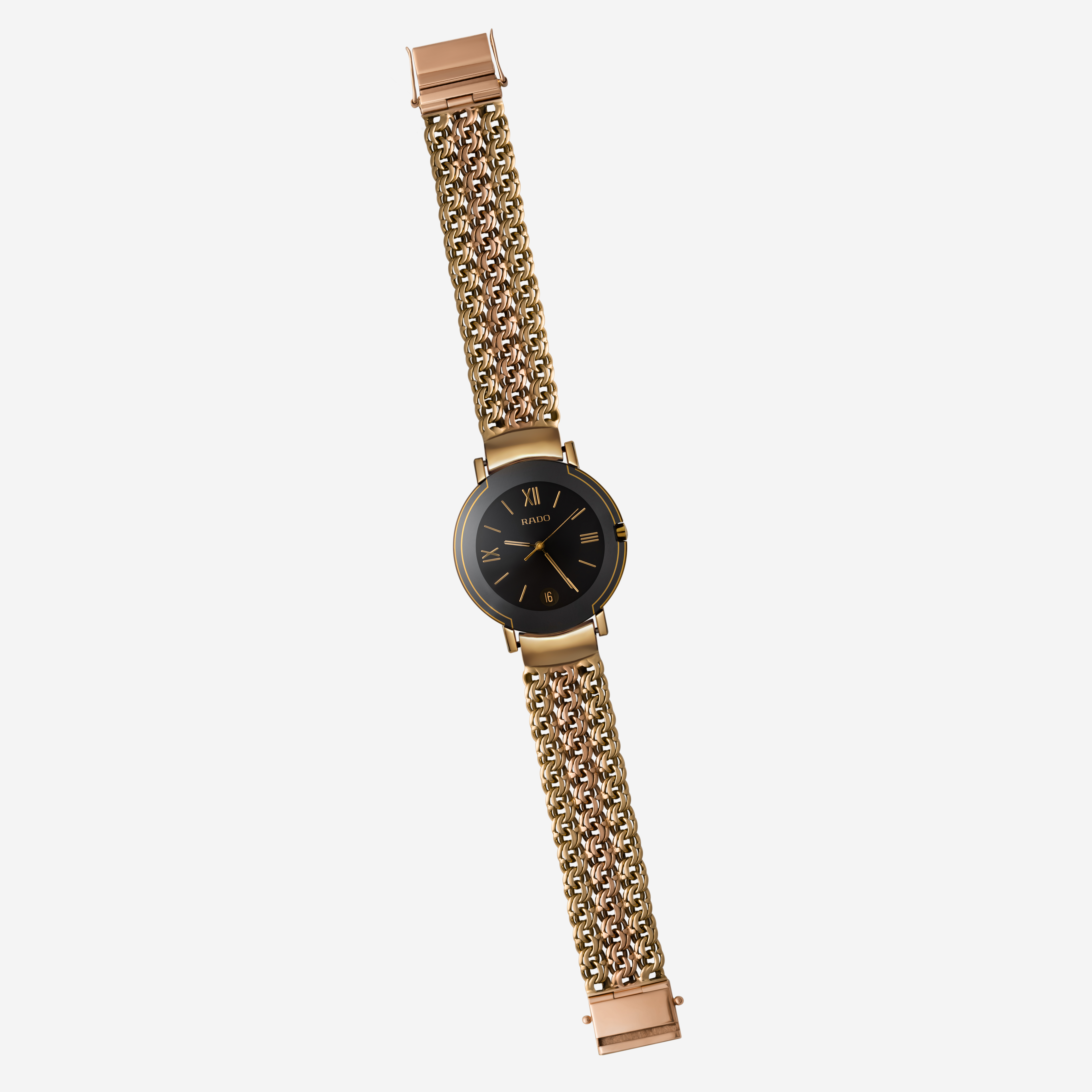Note: This timepiece unites an authentic Rado watch head with a handcrafted gold bracelet. The bracelet is an independent creation, not produced or endorsed by Rado. As the watch has been modified, the original Rado warranty may no longer apply. For more details, please see our full Authenticity Statement in the Information & Service section.